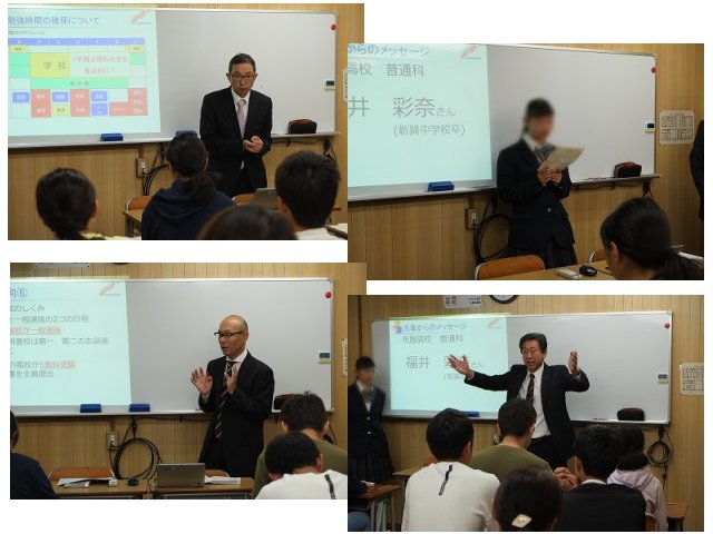 5月18日、生野本部校で学ぶ中学3年生の生徒・保護者のみなさんに集まっていただき、「入試ガイダンス」を行いました。 本年度の私立・公立入試結果分析、卒業生からの合格体験談、今後の受験戦略についてお話ししました。みなさん、本当に真剣に話を聞いて下さり、やる気のスイッチが入ったようです。特に先輩からのアドバイスは生徒たちの心に響いたようです。 これからしっかりがんばっていきましょう。