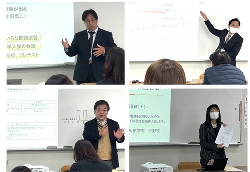11月29日(土)、受験本科5年生およびアドバンス4年生を対象とした保護者会を実施いたしました。 アドバンス4年生の保護者の皆様には、来年度より始まる受験本科コースについてご説明し、受験本科5年生の保護者の皆様には、受験学年の年間の流れや重要なポイントについてお伝えしました。 当日の様子は、以下の写真でもご覧いただけます。 お忙しい中、多くの皆様にご参加いただき、誠にありがとうございました。
