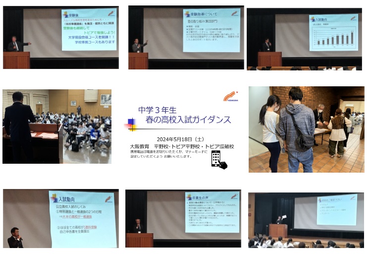 トピア瓜破校では、中学3年生対象の「春の入試ガイダンス」を平野区画整理記念会館にて実施しました。 ガイダンスでは、今春の私立・公立の入試動向をふまえた入試結果についての分析・解説、夏期講習など今後の指導、高校進学後の学習ポイントについて説明させていただきました。生徒・保護者ともにメモを取るなど自分のこととして真剣に聞いてくれていました。 次回は9/28にクレオ大阪南にて「秋の入試ガイダンス」を開催予定です。